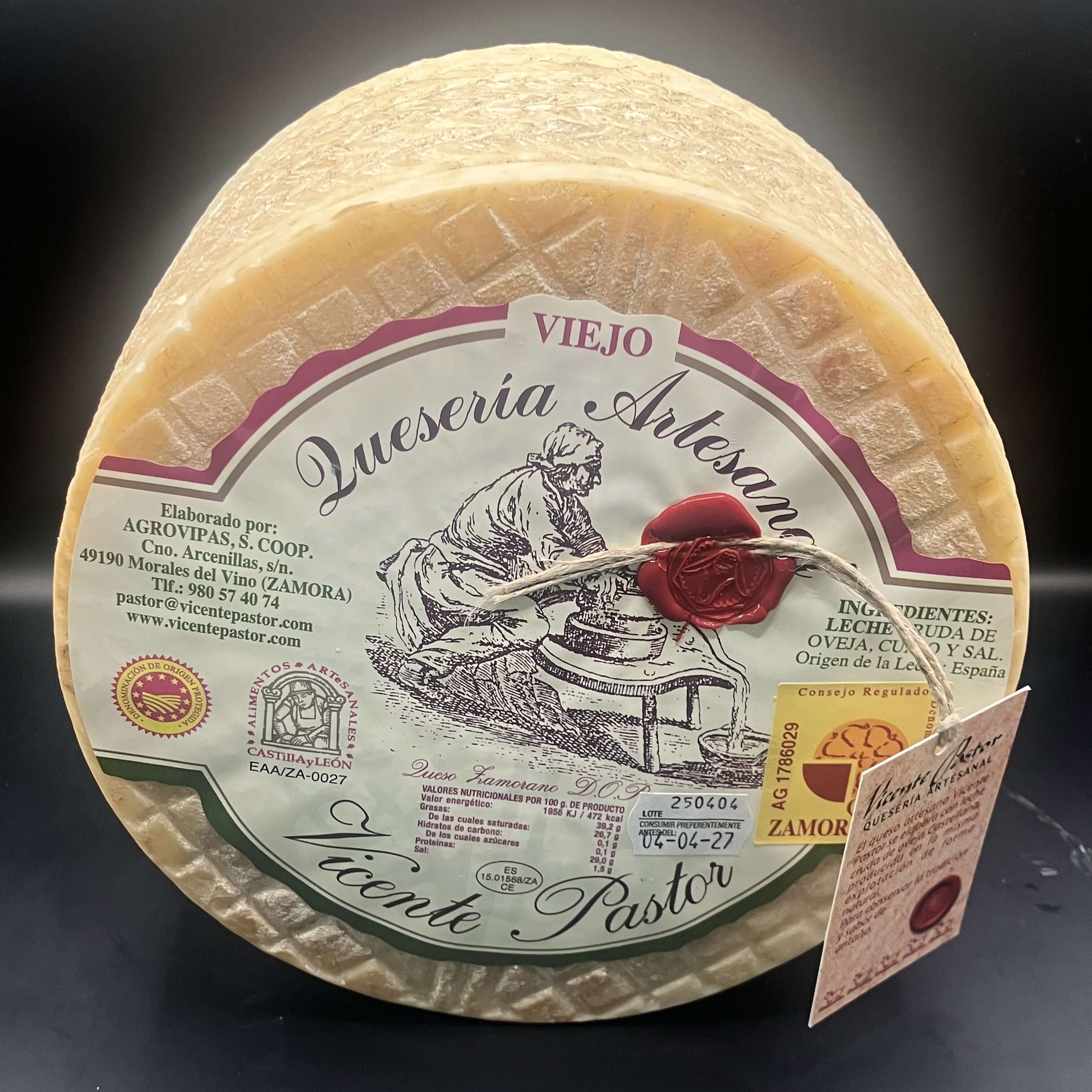 El Queso D.O. Queso Zamorano de la quesería artesanal Vicente Pastor está elaborado con leche cruda 100% de oveja castellana, de la variedad autóctona de la provincia de Zamora. Su maduración de 7 meses y el mimo artesanal de la familia Pastor dan como resultado un queso de sabor auténtico, intenso y equilibrado, con la Denominación de Origen Queso Zamorano, garantía de calidad y tradición.